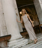 A slinky ‘70s-inspired halter dress, the Noemie is crafted from buttery silk satin graced with a nostalgic Françoise Foulard print. With a high neckline and halter ties at the neck, it features a fitted bodice with an invisible side zipper, an open back, and a bias-cut midi hemline. Non-functional self-covered buttons detail the side seam.