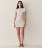 Rendered in a crisp organic cotton poplin, the Rizzo Dress is a pullover style with a bateau neckline, short puffed sleeves, and allover elasticized smocking. A fitted silhouette gives way to a mini-length skirt with a ruffle at the hem.