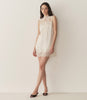 In a buttery silk satin, the Valeria Dress is a ‘90s-inspired sleeveless shift dress. It features a straight cut, a high neck, and a playful mini-length hemline. Intricate floral lace adorns the neckline, bodice and hem. Four self-covered buttons fasten at the back of the neck.