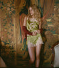 In buttery silk satin, the ‘30s-inspired Iona Short is an effortless pull-on style, featuring a high waist trimmed with elastic scallop detailing and intricate floral lace at the hems.