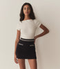 In a soft blend of organic cotton and merino wool with allover ribbing, the Seymour Skirt is a ‘60s-inspired mini with a high waist and an A-line cut. It features an elasticized waist, faux welt pockets, and contrast tipping.