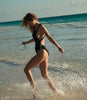 Inspired by 1960s swimwear, the Danica Maillot is a pinafore-style one-piece swimsuit with a high neckline, low back, and a medium-coverage leg cut. Made from stretchy, honeycomb texture swim fabric and fully lined, it’s adorned with oversized faux shell buttons at the hips and shoulder straps, which crisscross at the back for an elegant finish.