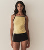 Crafted from a soft blend of regenerative and recycled cotton, the ‘90s-inspired Angie Ringer Tank features a fitted silhouette with navy contrast trim along the high square neckline and spaghetti straps.