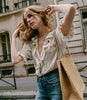 Crafted from the softest organic cotton voile, the Edwardian-inspired Hettie Top features a plunging V-neckline framed by a lace-trimmed ruffle that extends down the bodice. Colorful embroidered daisies and clustered pintucks lend texture to the yoke, back, and short puffed sleeves. A line of hidden starburst buttons extends down the center front. Wear it loose, or tuck it into your favorite high-waisted jeans.