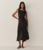 In lightweight ramie, the Levine Dress is a sleeveless column dress with a button front, a bateau neckline, functional waist and shoulder ties, and a center back slit at the hem for ease of movement.